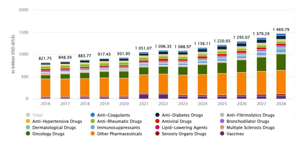 The Pharmaceuticals industry is projected to achieve a revenue of US$1,156.00 billion by 2024. Oncology Drugs are anticipated to be the leading segment, reaching a market volume of US$214.10 billion in the same year. Looking forward, this sector is predicted to grow at an annual rate of 6.19% from 2024 to 2028, resulting in a market volume of US$1,470.00 billion by 2028. The United States is expected to lead globally with a revenue of US$636.90 billion in 2024, attributed to its advanced healthcare infrastructure and robust research and development capabilities. The Pharmaceuticals market spans across various countries worldwide, with the United States standing out for its pharmaceutical innovation.