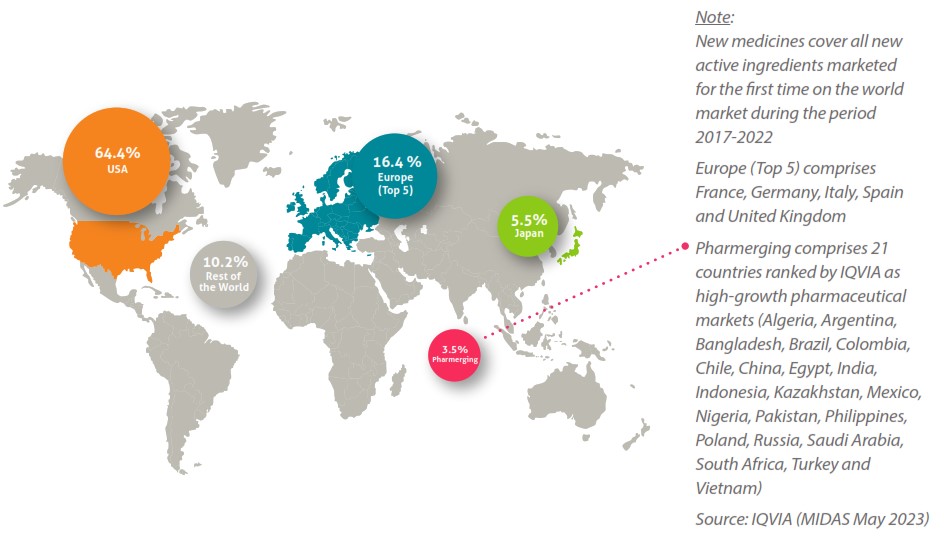 In 2022 North America accounted for 52.3% of world pharmaceutical sales compared with 22.4% for Europe. According to IQVIA (MIDAS May 2023), 64.4% of sales of new medicines launched during the period 2017-2022 were on the US market, compared with 16.4% on the Eu- ropean market (top 5 markets).
